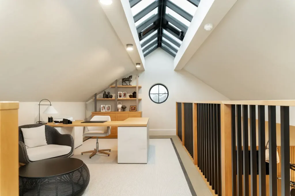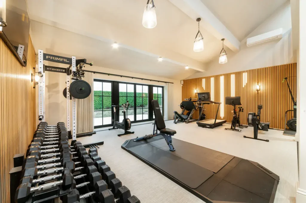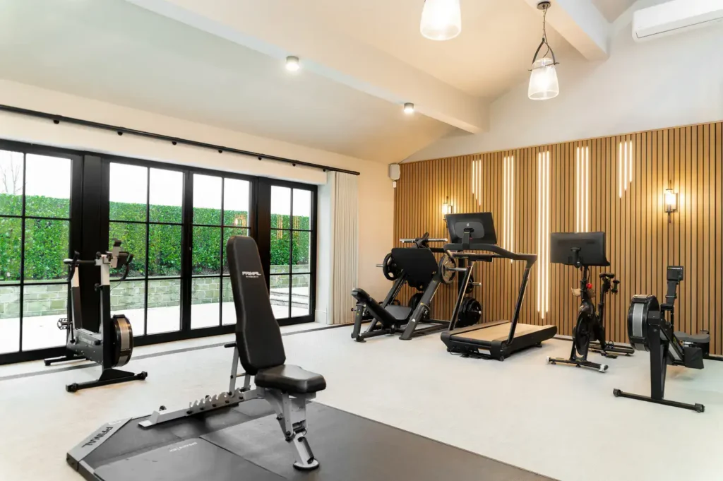 The design also needed to consider the adjoining home office, located one floor up on the mezzanine. While visually connected to the gym below, this space required a more elevated and luxurious feel, with comfortable seating and refined finishes suitable for hosting meetings. The result is a cohesive, thoughtfully designed environment that seamlessly balances performance, comfort, and sophistication.